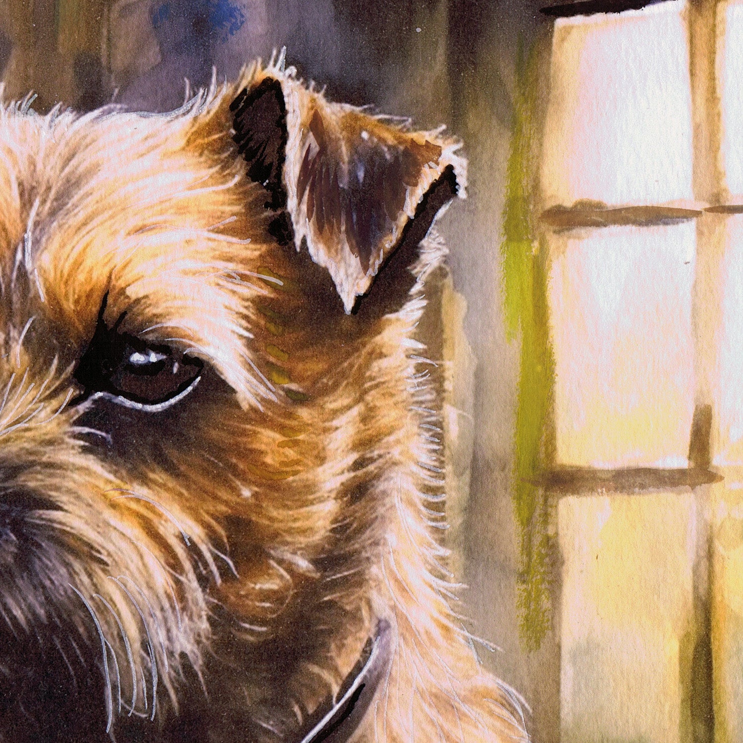The artwork portrays a Border Terrier resting its paws on a pub bar beside a pint of ale, illuminated by warm interior light. The scene captures the charm of a traditional pub atmosphere with rich amber and earthy tones. Printed on heavyweight matte paper using archival pigment inks to preserve every brushstroke and detail of the original artwork.